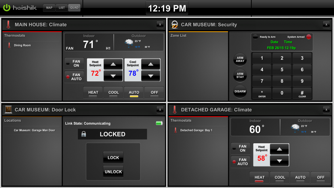 One of the views of our desktop software is the quad screen viewer. You can choose to monitor and control a different building is each of the four windows. For instance, you might want to keep an eye on the temperature of the Pennsylvania property barn loft in window one. You could set window 2 to show driveway alerts for all properties. That way you'll know anytime a delivery person or guest shows up at the main house or any of the secondary homes. In window 3, you might make sure that all the doors are locked at the beach house. And finally, you could use window four to turn off any interior lights that house cleaners may have left on in the main house.